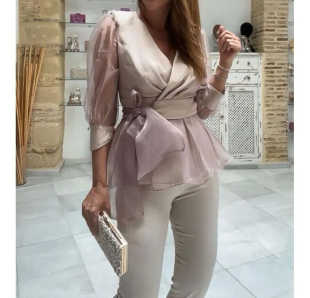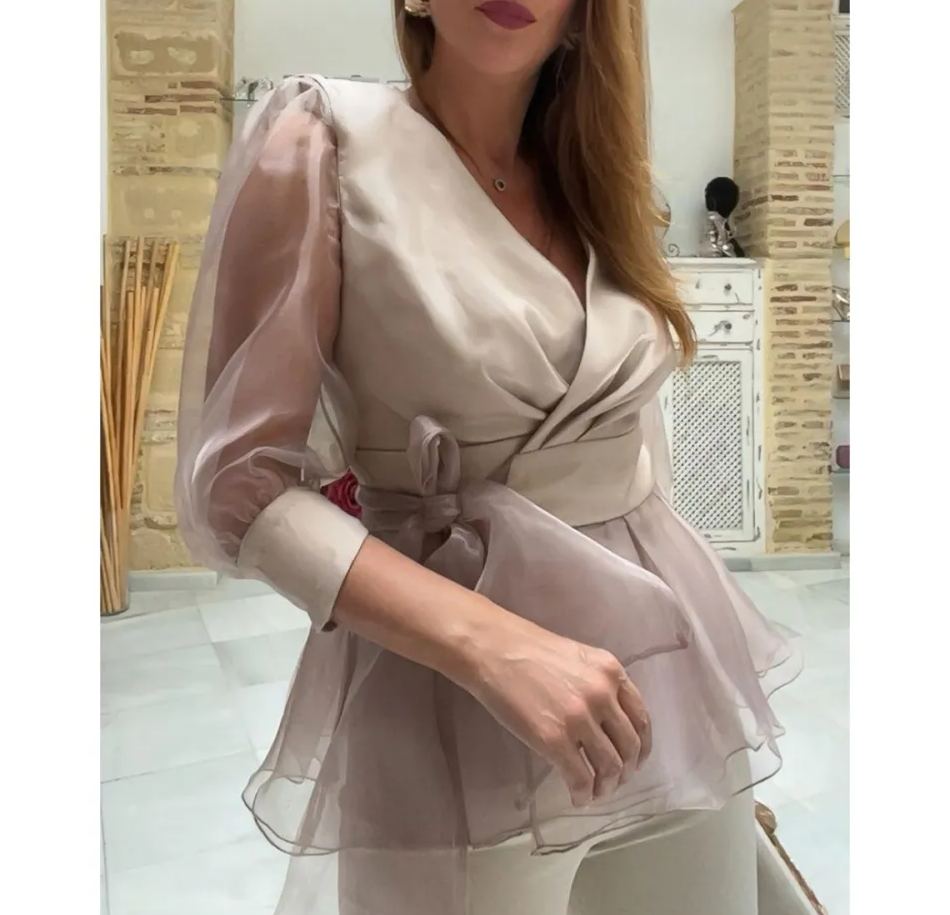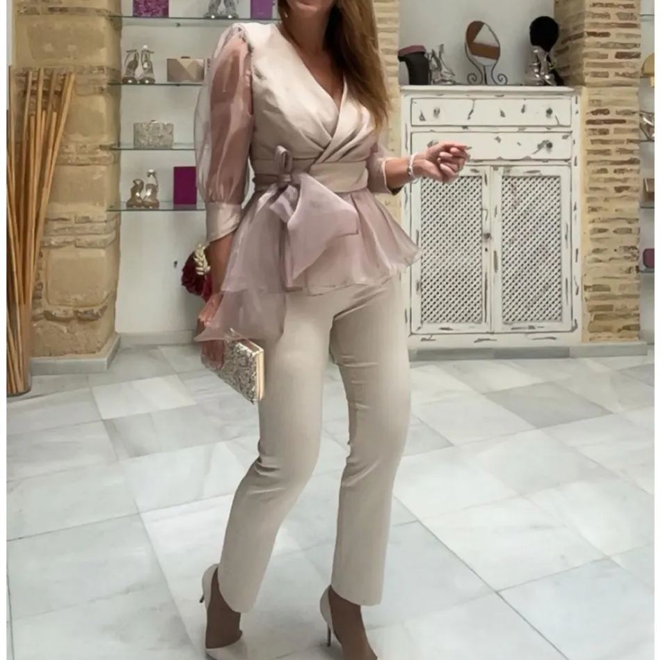 Conjunto de top cruzado de organza color champán con pantalón ajustado
