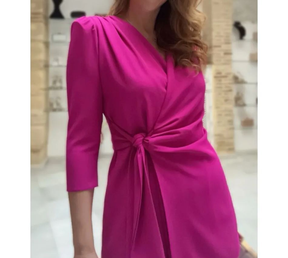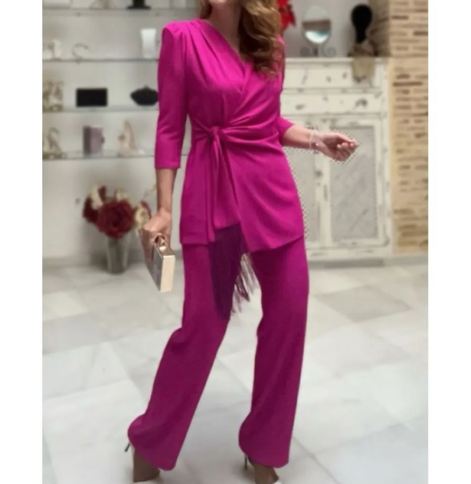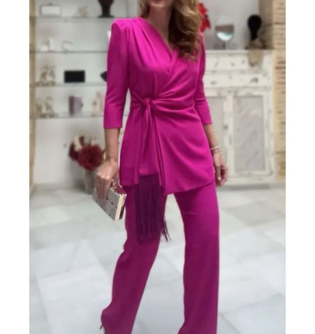 Elegante conjunto de top cruzado fucsia y pantalón ancho