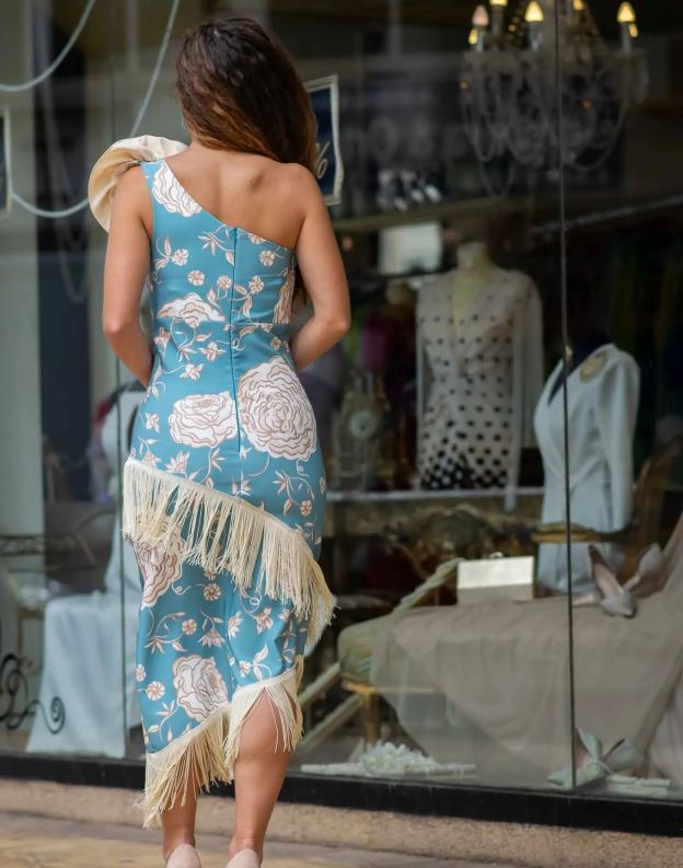 Este llamativo vestido amarillo de un solo hombro irradia encanto y sofisticación con su estampado floral blanco y su elegante corte asimétrico. Con un divertido borde de flecos y una dramática flor de gran tamaño en el hombro, este vestido de longitud midi está diseñado para cautivar. Su ajuste entallado favorece la figura mientras añade un toque de glamour caprichoso.