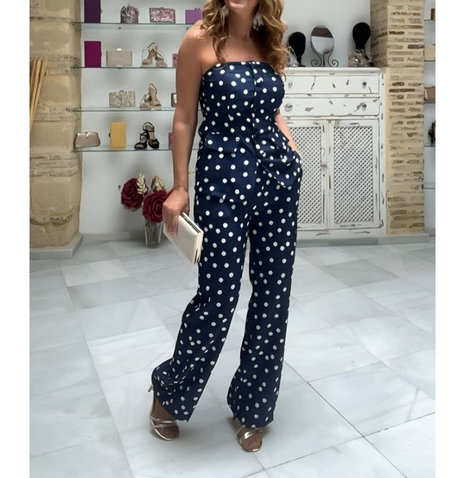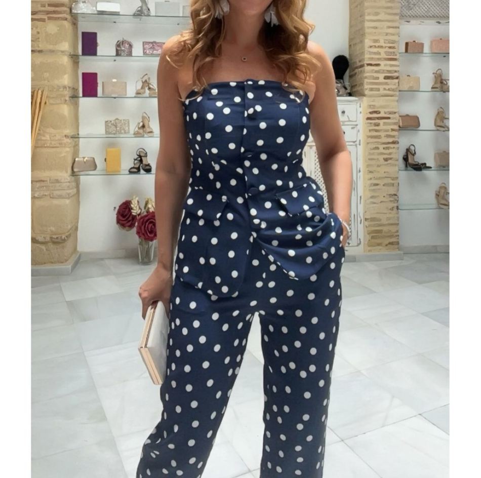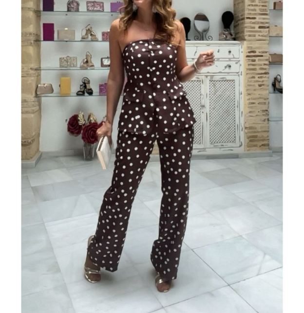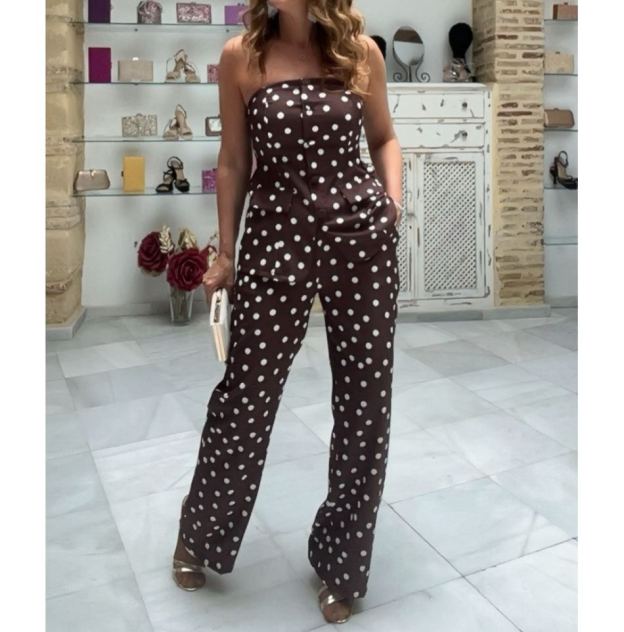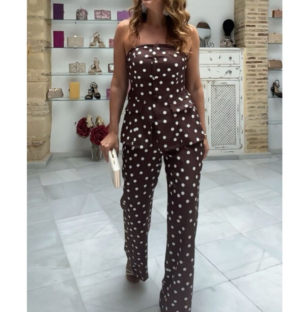 Divertido pero pulido, este mono sin tirantes presenta una base de chocolate rica adornada con clásicos lunares blancos. El corsé estructurado fluye hacia un peplum favorecedor que acentúa la cintura, mientras que los pantalones de pierna ancha ofrecen comodidad y elongación. Un look encantador y moderno ideal para hacer una declaración de estilo.