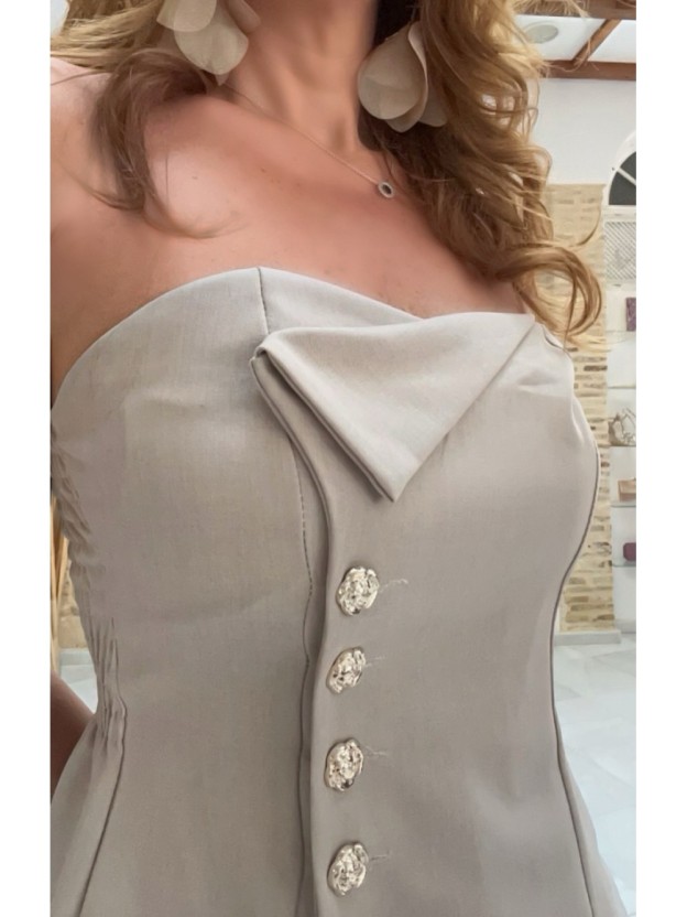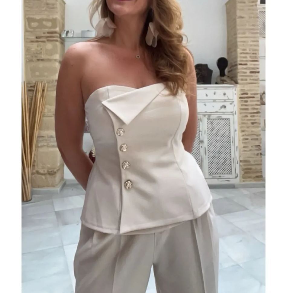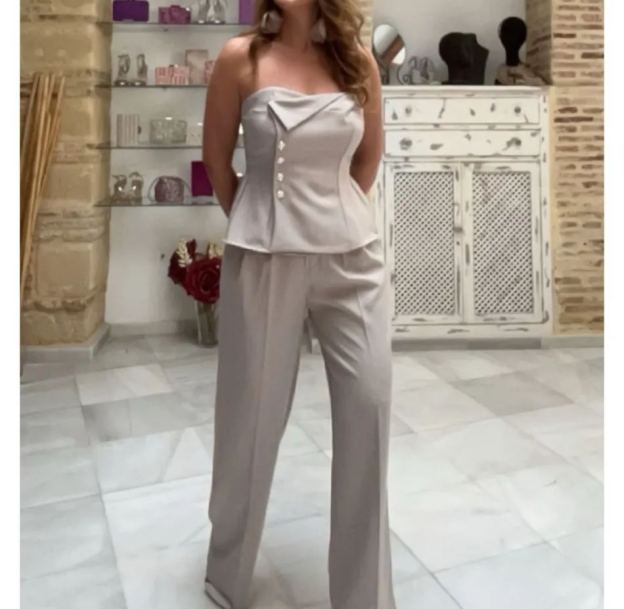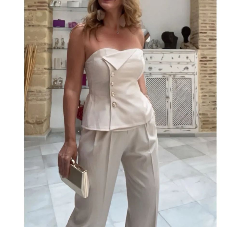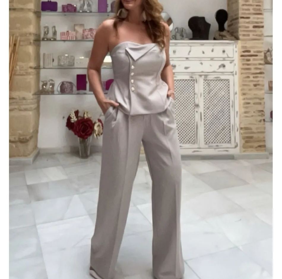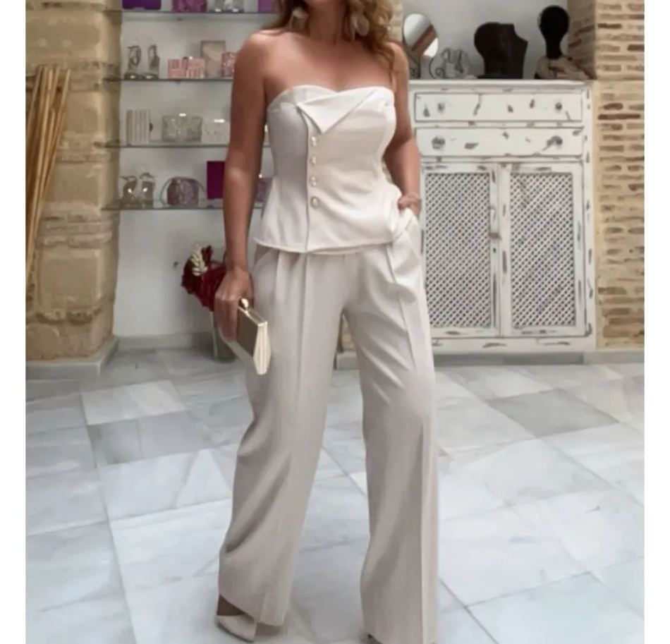 Conjunto de top peplum de satén sin tirantes y pantalones de pierna ancha